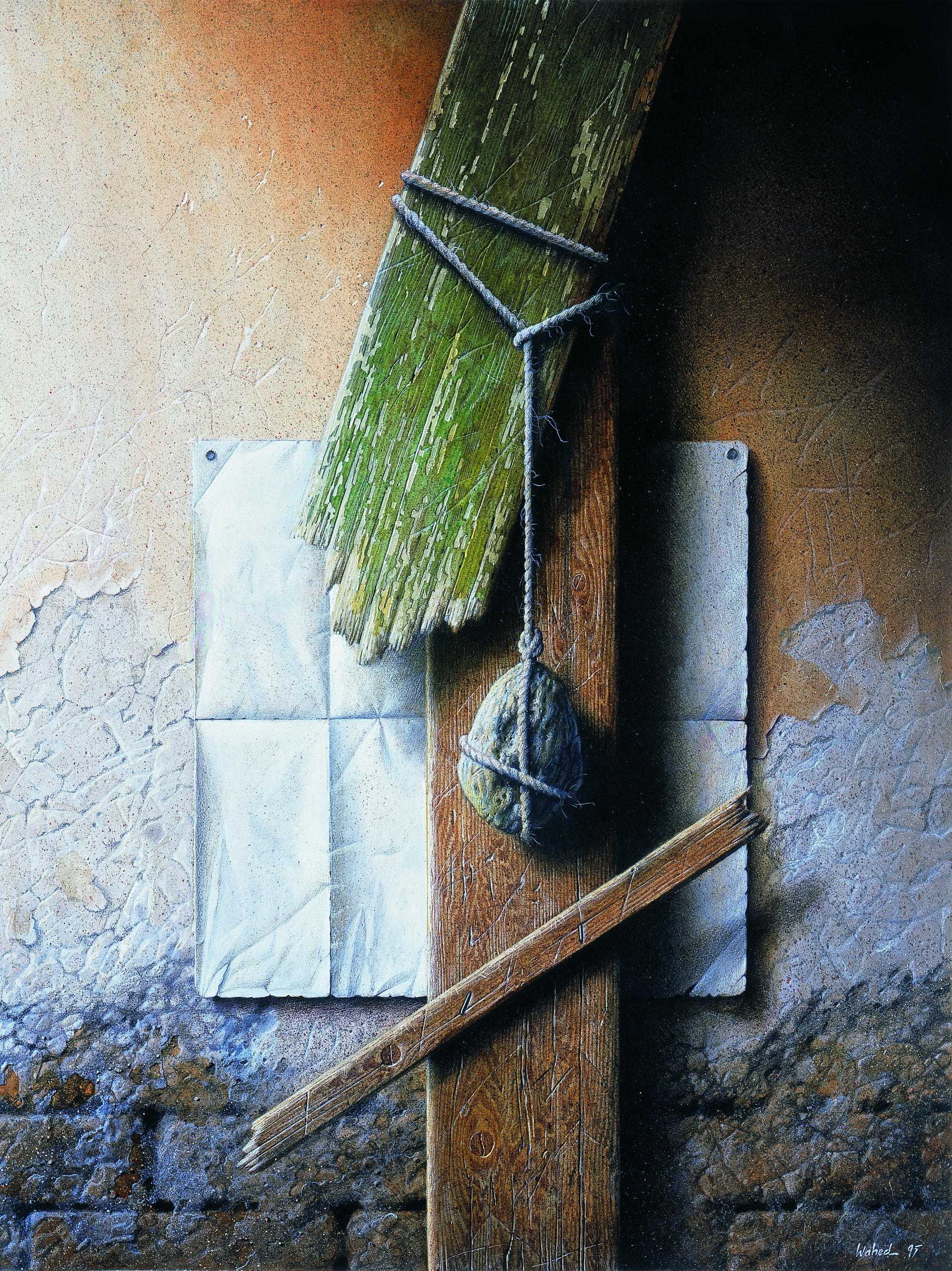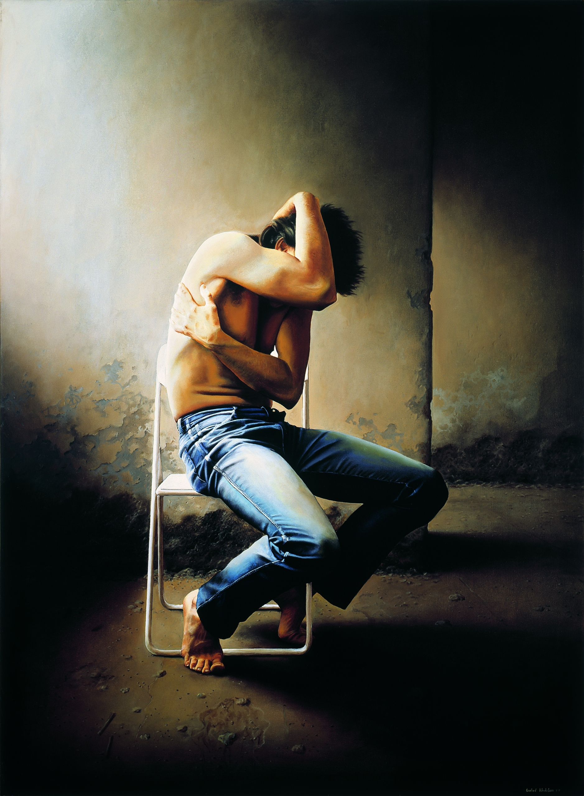 The second turning point in his life was the revolution (1978) followed by war with Iraq which brought about major changes in his way of thinking. Now human beings step on the stage of his paintings as well, workers, deprived classes, loneliness, death, torture, social and cultural antagonisms carefully depicted in brown colors shinning with a light associating Rembrandt and other 18th and 19th centuries European painters while the same ambivalence and equivocal surrealist air still dominated them. Elements of the past like cloud, ambiguous backgrounds, vast planes and lack of time-space too could still be seen in this prolific period of his creativity.