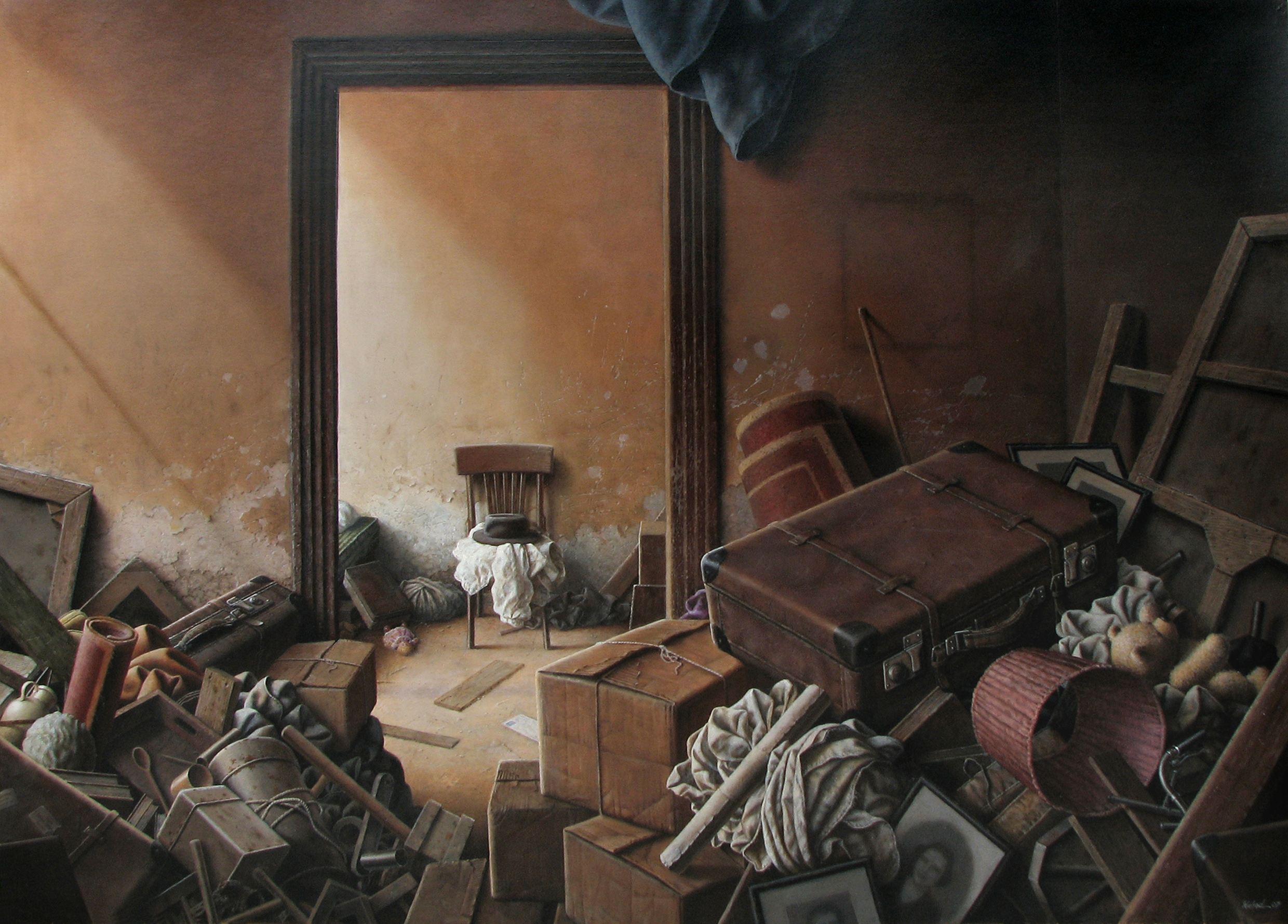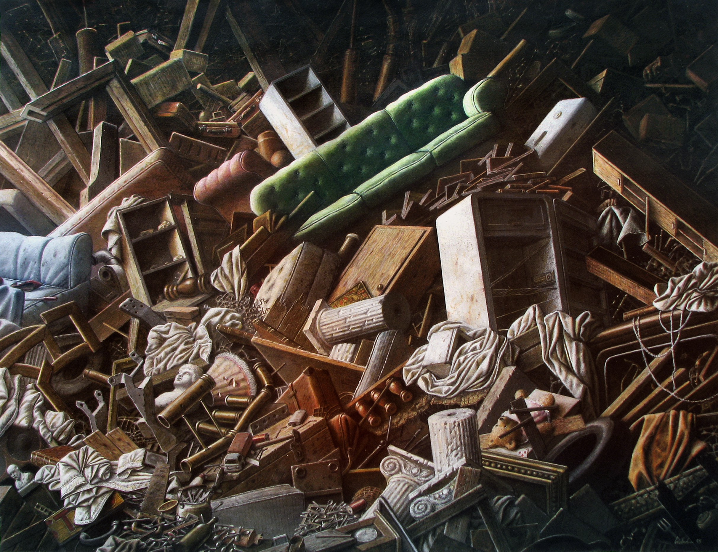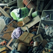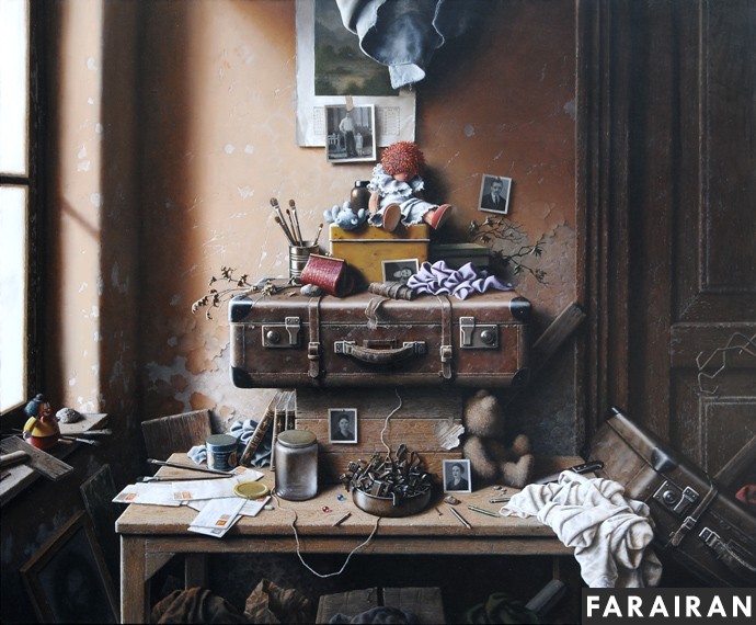This must be where the cluttered air of old antique shops of a great number of his paintings come from which for Iranians can bring to mind one of the main heroes of Sadeq Hedayat’s Blind Owl – pirmard khenzerpenzeri, or the tattered old man. And it must be the Baroque and Renaissance air of his paintings (not excluding their surrealistic realism) which speaks to Europeans in a familiar language.